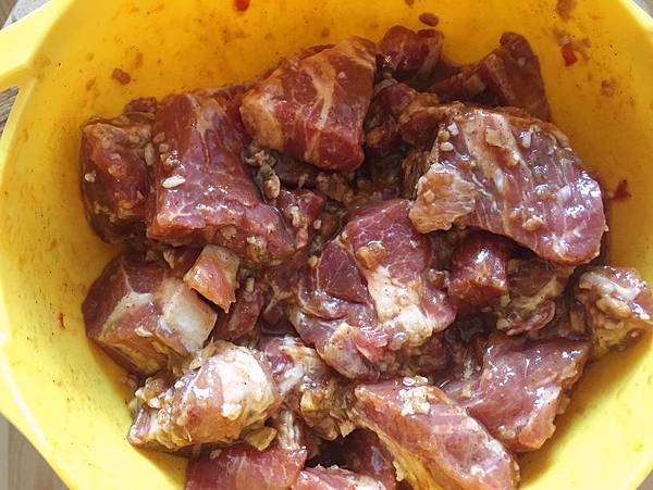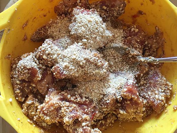 3. 醃料:醬油4.5大匙、米酒1.5大匙、香油1大匙、糖1大匙、胡椒鹽2小匙、豆瓣醬跟酒釀各1大匙(酒釀沒有可以省)