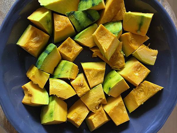 3.把南瓜切成適當大小的塊狀後鋪在深盤的盤底。