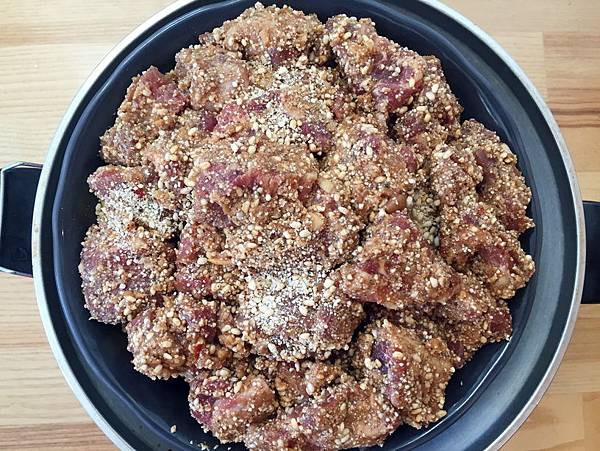4.接著放上裹上粉的梅花肉,外鍋放2.5杯水,按下電源,跳起即可享用。