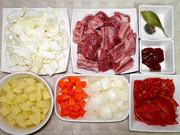 1.備好所有食材。牛肋條洗淨,切成4cm長段。馬鈴薯削皮切丁狀,用清水沖洗3-4次去除澱粉質後,暫泡水防氧化變色。牛蕃茄去皮,一顆切丁狀,一顆切碎增加蕃茄味。其餘蔬菜均去皮切丁狀,備用。