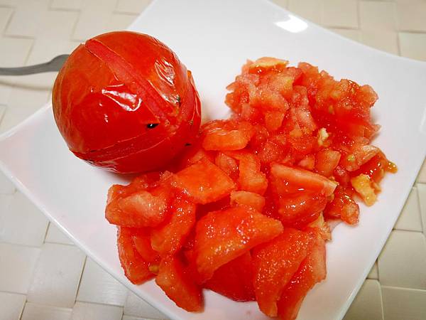 2.【極簡蕃茄去皮法】蒂頭插上叉子,從底部如圖輕切「十字」,用小火烘烤底部和四周約30秒,外皮即能輕易剝除(小心燙)。