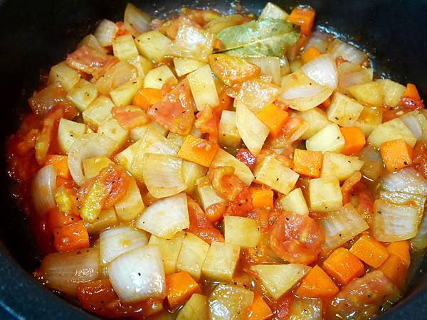 4.原鍋不洗,利用牛肉煎出的油脂來炒香蔬菜類(只保留一大匙油,其餘撈除)。先用「小火」炒香洋蔥丁,再放進蔬菜類(高麗菜丁除外)和【調味料】拌炒。