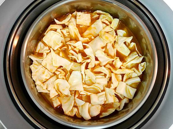 5.取出大同智慧AI電鍋,(外鍋)倒進1米杯水量。(內鍋)先放進所有炒料和高麗菜丁,再加進3米杯水量,蓋上外鍋蓋,準備燉煮。