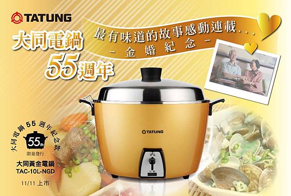 在大同邁入第55個年頭之際,推出紀念款黃金電鍋,藉由黃富賢伉儷的金婚紀念,讓此款黃金電鍋推出更具意義,在這情比金堅的50年金婚中帶有著一段大同電鍋的故事也鼓勵我們藉由大同電鍋與台灣人歷久彌新的深厚情感不斷推陳出新,持續帶給每位使用者美好的烹調經驗。