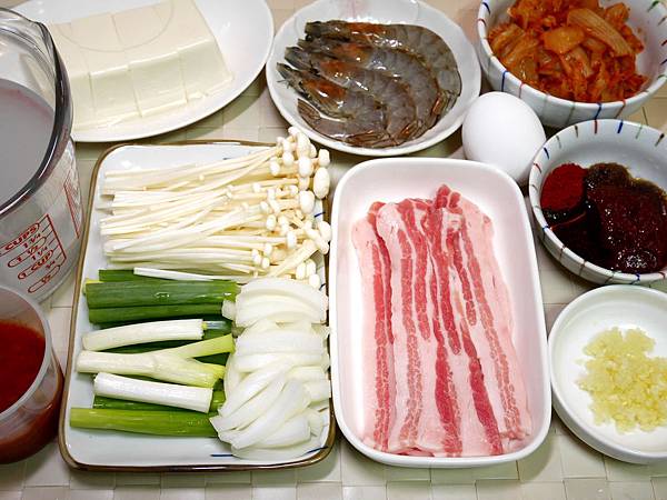 1.備好所有食材。豆腐切塊,金針菇用水稍沖,切除底部。洋蔥切絲,青蔥切段。白蝦去尖刺去腸泥,泡菜與泡菜汁分裝,洗米水準備好。【調味料】事先調勻,備用。