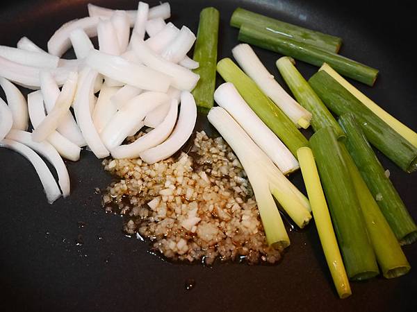 2.起油鍋(1大匙麻油),小火將【爆香材料】炒香。(約2-3分鐘)