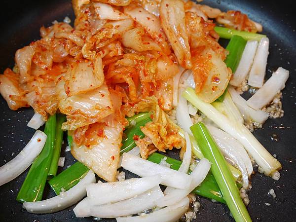 3.接著,放進泡菜拌炒出香氣。(約3分鐘)(醃漬類炒過,可柔化嗆味,亦可省略此步驟)