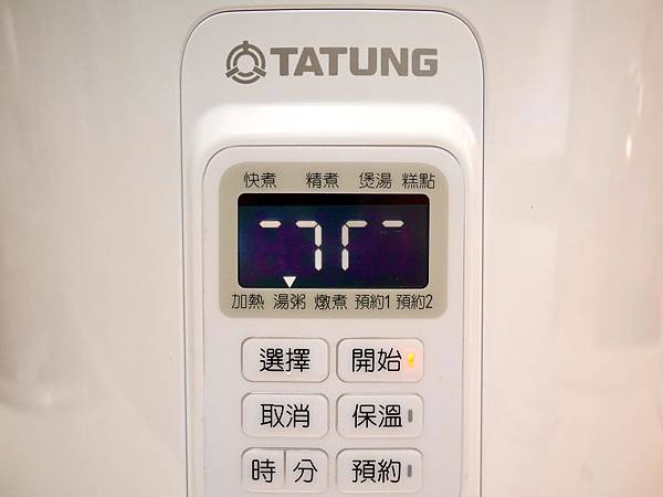 5.點按LED顯示面板上的[選擇]鍵→移動至[湯粥]鍵→按下[開始]鍵即可。蒸煮完成時,會發出嗶嗶嗶三連音。此時,側掀鍋蓋(小心蒸氣),趁熱快速打顆蛋,擺上蝦子,有蛤蜊也可順便放進,蓋上鍋蓋續燜5-6分鐘即可。
