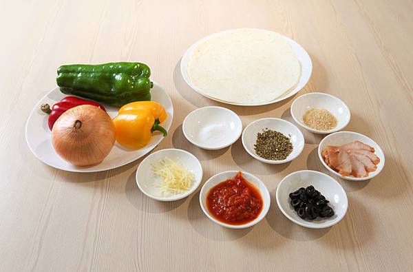 1. 備料如圖,將醬料加熱混合備用,餅皮攤開淋上醬料,再將食材材料均勻撒在餅皮上最後鋪上起司。
