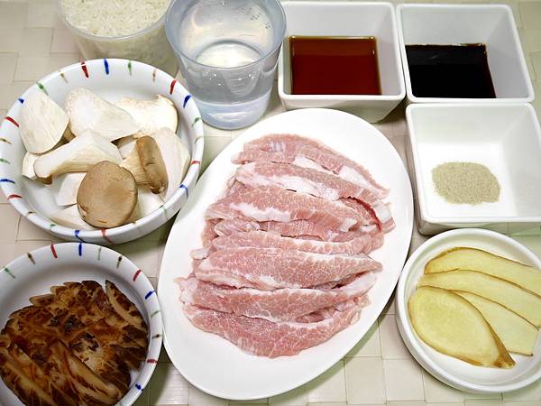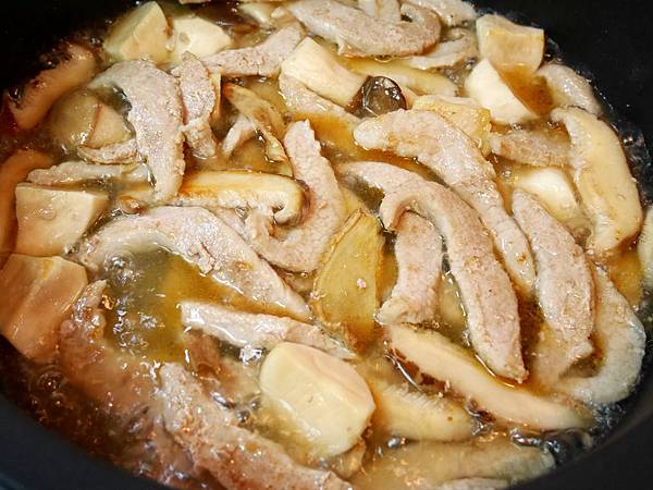 1.備好所有食材。松阪肉洗淨,逆紋切片狀。杏鮑菇用水稍沖,切滾刀狀。老薑洗淨切片。香菇泡軟切細絲,香菇水保留。