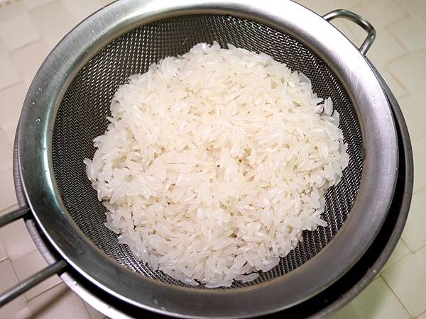 2.先將米洗淨,並置於「篩網內」瀝乾水份,備用。(此步驟不可省,這是掌握後續水量的重要關鍵)