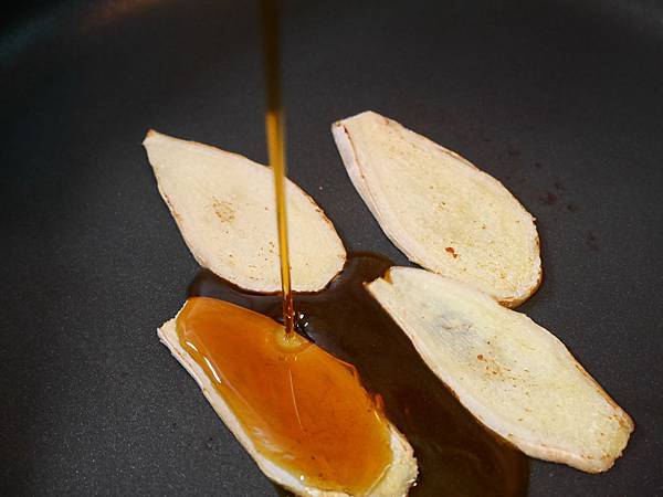 3.取一鍋,用中火將薑片水份煸乾,呈現邊邊捲曲狀。再轉小火,倒進麻油至麻油薑味飄香。(約3分鐘)(麻油不耐高溫,故先煸薑再加麻油)