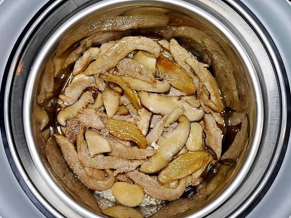 6.取出大同智慧AI電鍋,(外鍋)倒進1米杯水量。(內鍋)先鋪進 米,再鋪上步驟5的炒料(不含湯汁)。最後,倒進[和米同份量]的水量,即[步驟5的湯汁+香菇水+開水]。