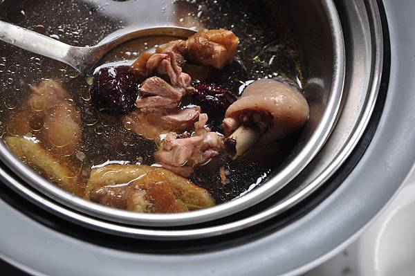 2. 將雞肉塊以熱水略汆燙過 ,再將全部備料置入電鍋,注入適量水,外鍋2米量杯水。