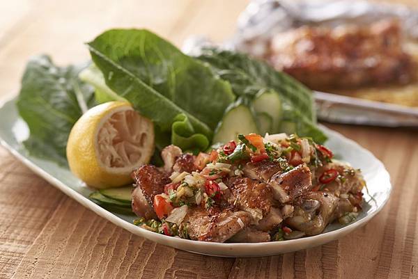 3.將醃製過的去骨雞腿入烤箱強蒸烤上管200℃/下管200℃/15分鐘,烘烤上管220℃/下管220℃/10分鐘,上色後取出待半涼再切塊,淋上調味料搭配映鮮蔬菜,即可上桌享用。