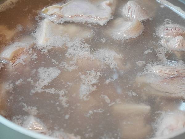 2.【羊肉冷水入鍋煮,腥羶味不再有】起一鍋冷水,直接放進羊肉塊,用(極小火)煮至水面開始冒泡泡(水滾前),水面將浮出比圖片還要多的浮沫雜質(約13分鐘),接著撈出沖冷水洗淨即可。(此步驟不可省)