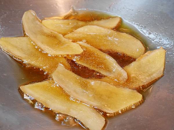 3.起油鍋(2大匙黑麻油),冷鍋放進薑片,用小小火慢慢將薑片煸香。(麻油高溫易變質,請用小小火)