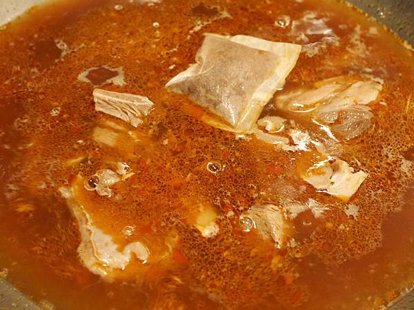 5.接著,原鍋放進滷包和清水,先大火煮滾,再轉小火煮約15分鐘,期間鍋中會飄出羊羶味。(勿蓋上鍋蓋)(去除羊羶味重要步驟,勿省略)
