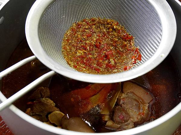 8.燉煮完成時,取出滷包,並用篩網過濾湯頭一次,只保留羊肉和白蘿蔔,色相較佳。