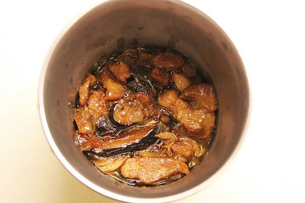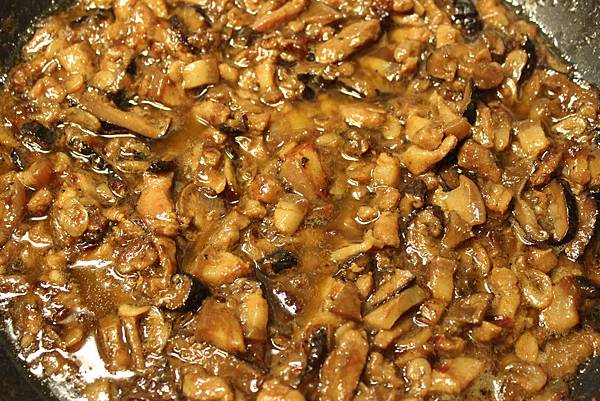 1.將香菇肉燥拌炒到香氣出來後,加入水及調味料(滷香菇肉燥作法請見~台式萬用肉燥篇)。