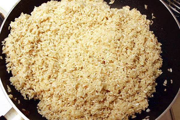 3.把泡好瀝乾的糯米,倒入只剩湯汁的鍋中,小火拌炒到湯汁快收乾。