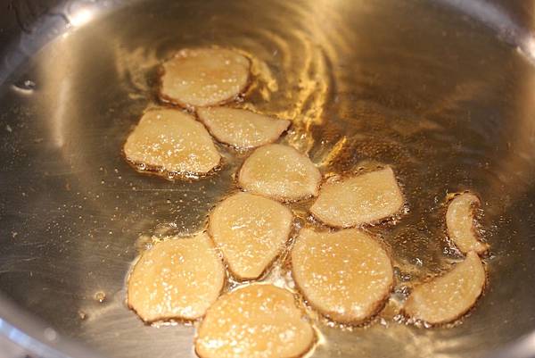 2.起油鍋,中小火爆香薑片至香氣出來、邊緣呈現捲曲狀。