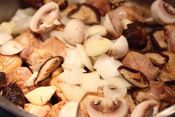 4.待雞皮的油脂被煸出後,放入洋蔥、蒜頭、香菇拌炒至香氣出來。