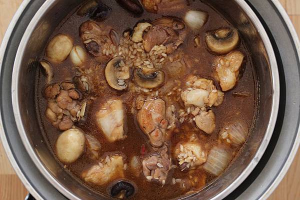 5.將洗好的米加入鍋中,再加入調味料拌勻後,放入大同電鍋內鍋,外鍋放2杯水,按下電源。