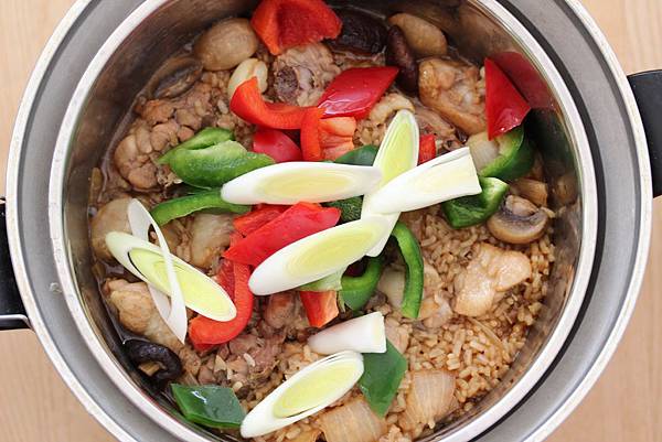 6.電源跳起後,加入青椒、甜椒、蒜苗,拌勻後,外鍋再放0.5杯水,按下電源,等跳起後再悶5-8分鐘即完成。