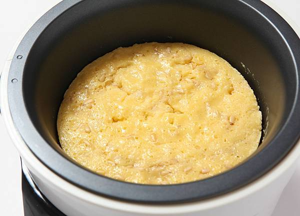 2.全部材料混和拌勻後,倒入湯鍋,選擇蛋糕模式,待提示音響起完成後,將湯鍋倒放,即可輕易使蛋糕脫模。