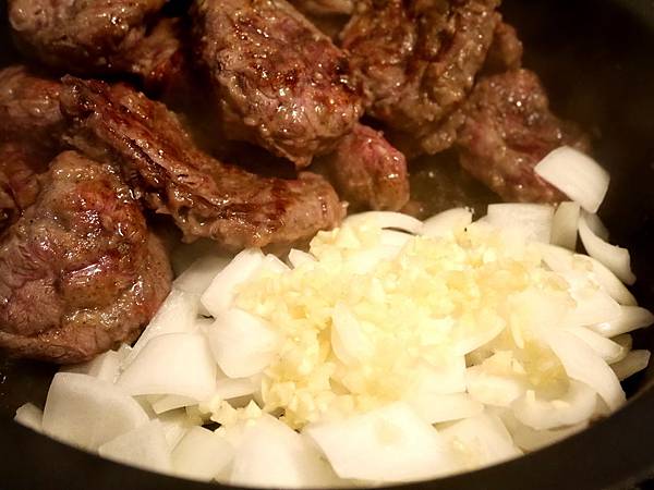4.暫將牛肉撥至鍋旁,放進洋蔥丁和蒜末炒香後,整鍋拌炒均勻。(約5分鐘)