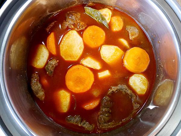 6.取一電鍋,(內鍋)放進步驟5已完成的炒料、紅蘿蔔塊、馬鈴薯塊、高湯。(外鍋)加進2米杯水量,重複進行3-4次至牛腱心軟熟,耗時約90-120分鐘。燉煮完成時,加進【調味料B】拌勻,再續燜10分鐘即完成。
