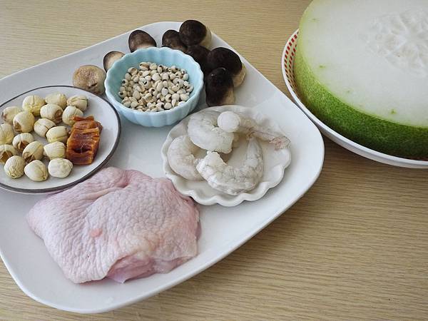 1.準備食材:蓮子、薏仁預先泡水2小時;干貝以100ml水泡軟後撕成細絲,水留著備用。雞腿切丁醃20分鐘。蝦仁切1.5cm長的丁,用鹽及太白粉抓勻,放冷藏醃15分鐘。冬瓜去皮切丁(1.5cm x 1.5cm)。草菇擦乾淨對切。