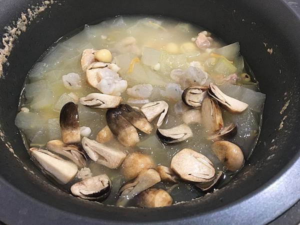 7.煮了45分鐘的時候,打開鍋蓋,沸騰的冬瓜湯香氣四溢,冬瓜肉已煮至軟綿,湯色濃。
