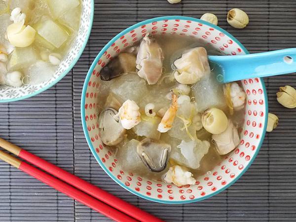 材料豐富的冬瓜什錦湯,集合雞肉、海鮮、蔬菜、五穀的精華,不僅好喝得很,更有去水排毒效果。夏天喝一大碗,可以代替正餐,高纖低卡又飽足❤