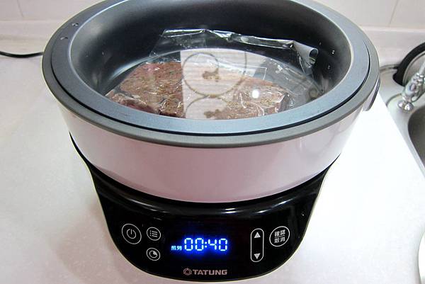 4.再將真空包好的牛肉放進預熱好的水中(水要蓋過所有牛肉) 。