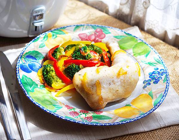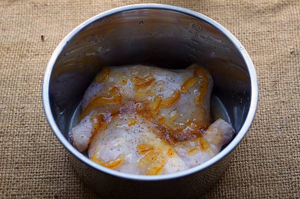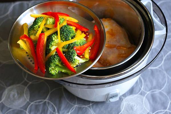 4.內鍋放入雞腿排,蒸盤架上內鍋。
