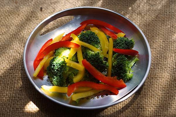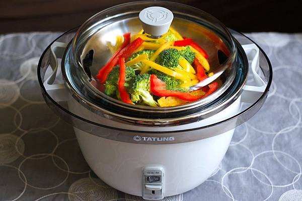 5.外鍋加1米杯水,見時蔬熟成取出蒸盤,外鍋再加1米杯水,開關跳起後取出。觀察玻璃上蓋可在蔬菜未變黃時即取出。