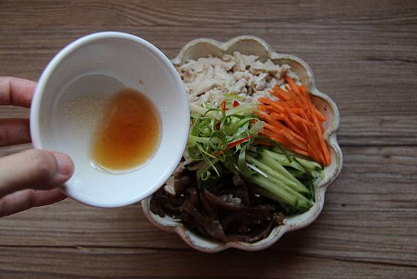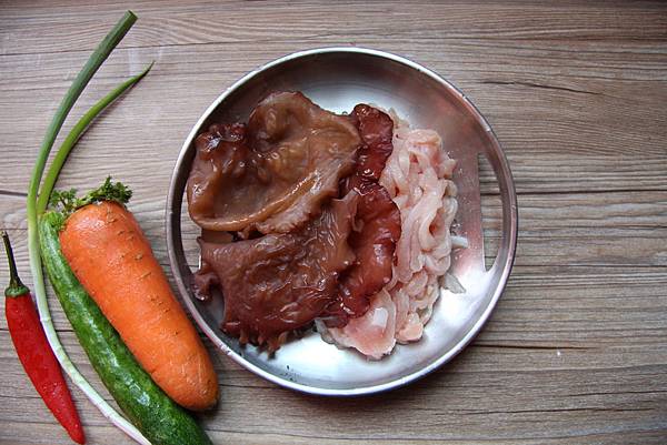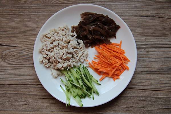 8.將木耳,雞絲,小紅瓜,紅蘿蔔切細