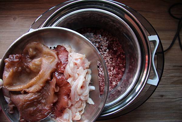 5.外鍋加入1杯水,放入紫米飯,再放上木耳雞絲一起燉煮,讓雞汁精華流入米飯中