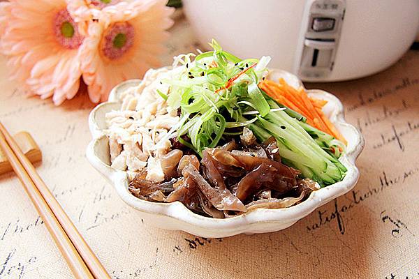 夏天非常開味的涼拌木耳雞絲,酸酸甜甜~配上養身的紫米燕麥飯,就算冷掉也很好吃,而且只要使用大同電鍋就能一次完成,獨特的蒸盤設計可以讓食材的精華流入米飯中,一點都不放浪費唷^^