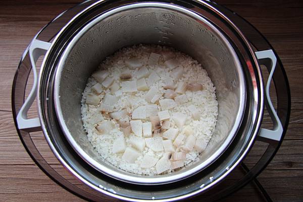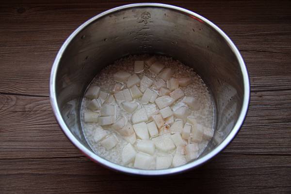 3.把白米加一杯水,加入切塊的山藥,放入電鍋中。