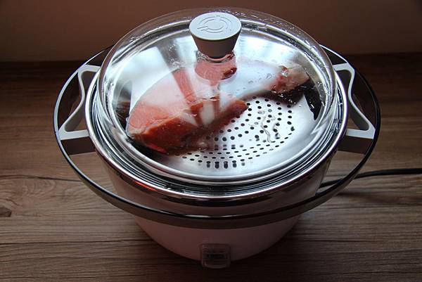 5.外鍋加入一杯水後按下蒸煮鍵,讓鮭魚的精華流入米飯中