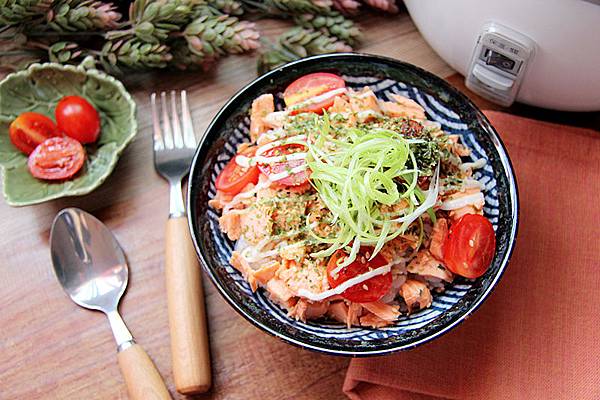 日式的鮭魚丼,在家用大同電鍋就能搞定!把鮭魚放入大同星球電鍋的獨特蒸層,讓鮭魚的湯汁直接流入米飯中,加入山藥和米飯一起燉煮,簡單的丼飯就有滿滿的營養!加入海苔和美乃滋調味,甜甜鹹鹹超開胃XD