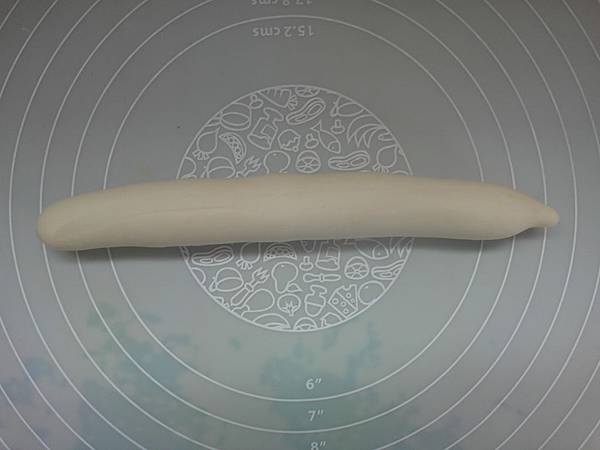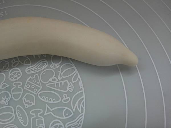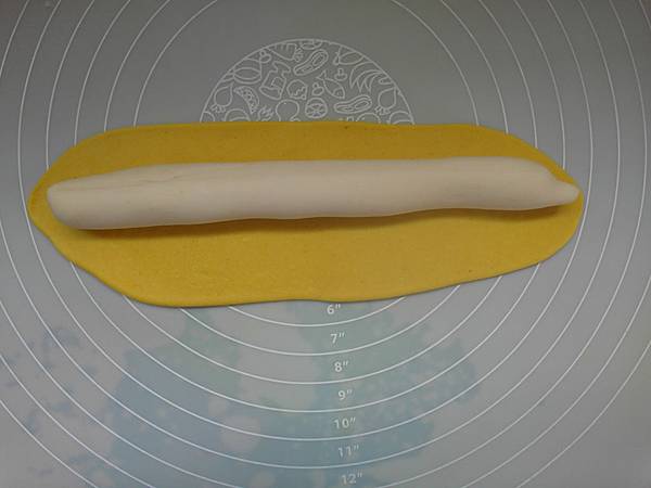 4.將黃,白麵糰分成2份,白麵糰搓成長條狀