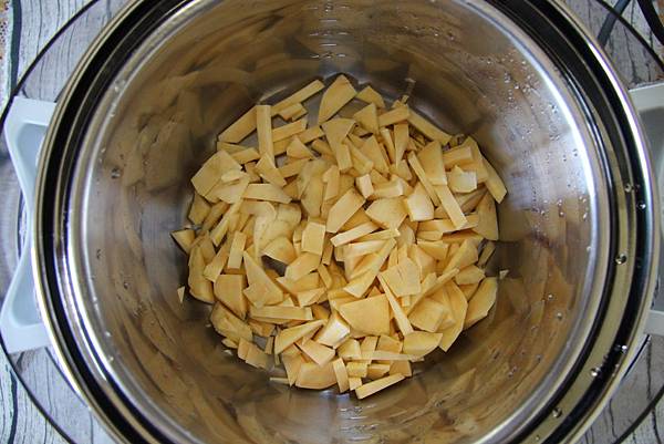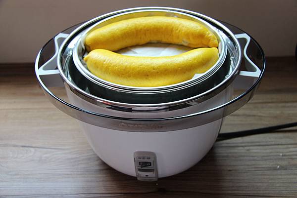 9.製作地瓜泥: 地瓜去皮後切小塊放入電鍋中,外鍋加入一杯水,上層放入發酵至2倍大的香蕉饅頭一起蒸煮