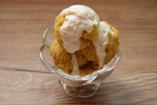 13.地瓜取出後壓成泥,淋上煉乳即可