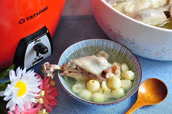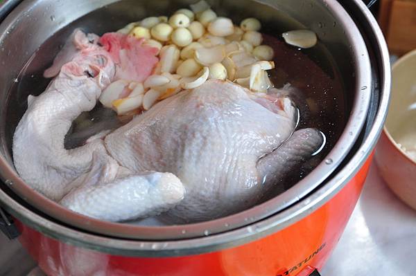 3.將土雞、蓮子、百合全下鍋後再注入適量水(目視約為7分滿水),外鍋則注入目視約8分滿水位開始啟動電源燉煮 ► 善用電鍋省時燉湯