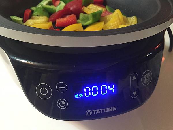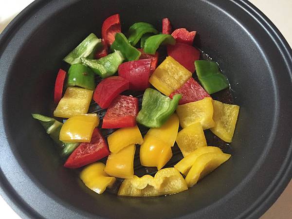 8.原鍋選擇煎烤模式(保有煎雞肉的醬汁和水份),溫 度設定130度4分鐘,放入彩椒,蓋上鍋蓋。