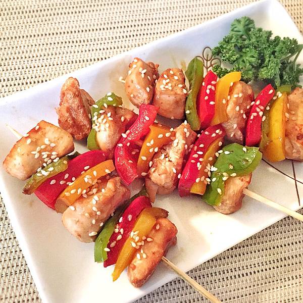 10.用竹籤將烤好的彩椒和雞肉塊串起來,撒上白芝麻就可以食用囉!